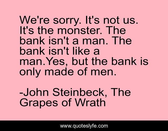 This page presents the quote "We're sorry. It's not us. It's the monster. The bank isn't a man. The bank isn't like a man.Yes, but the bank is only made of men.". Author of this quote is John Steinbeck, The Grapes of Wrath. This quote is about banks, the-grapes-of-wrath, greed, capitalism,.