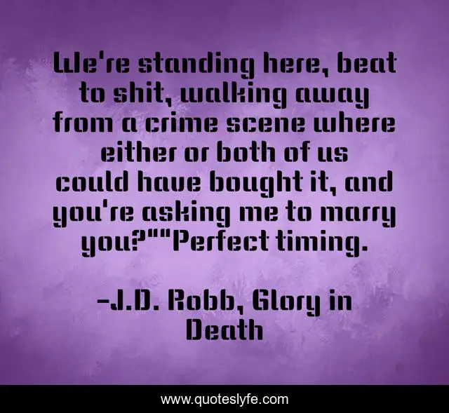 This page presents the quote "We're standing here, beat to shit, walking away from a crime scene where either or both of us could have bought it, and you're asking me to marry you?""Perfect timing.". Author of this quote is J.D. Robb, Glory in Death. This quote is about death, eve-dallas, glory, glory-in-death,.