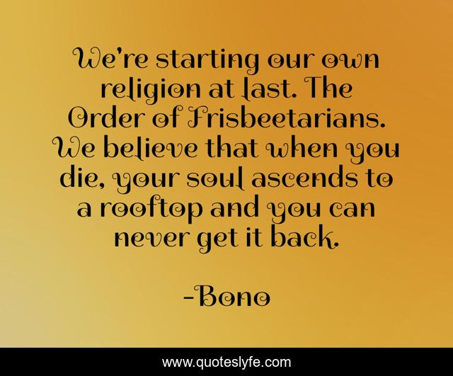 This page presents the quote "We're starting our own religion at last. The Order of Frisbeetarians. We believe that when you die, your soul ascends to a rooftop and you can never get it back.". Author of this quote is Bono. This quote is about religion, frisbee, bono,.