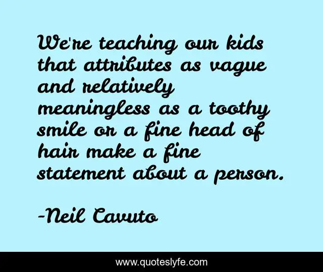 This page presents the quote "We're teaching our kids that attributes as vague and relatively meaningless as a toothy smile or a fine head of hair make a fine statement about a person.". Author of this quote is Neil Cavuto. This quote is about hair, person, kids,.