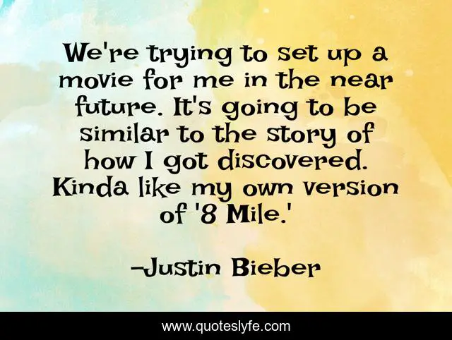 This page presents the quote "We're trying to set up a movie for me in the near future. It's going to be similar to the story of how I got discovered. Kinda like my own version of '8 Mile.'". Author of this quote is Justin Bieber. This quote is about me, story, trying,.