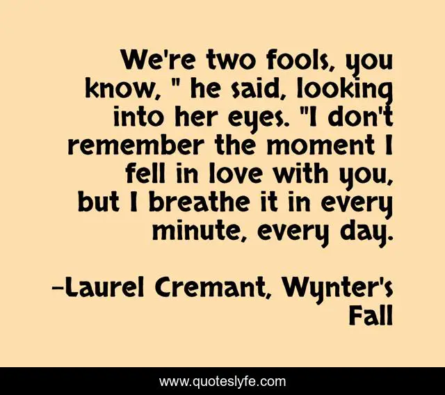 This page presents the quote "We're two fools, you know, " he said, looking into her eyes. "I don't remember the moment I fell in love with you, but I breathe it in every minute, every day.". Author of this quote is Laurel Cremant, Wynter's Fall. This quote is about romance, mythology,.