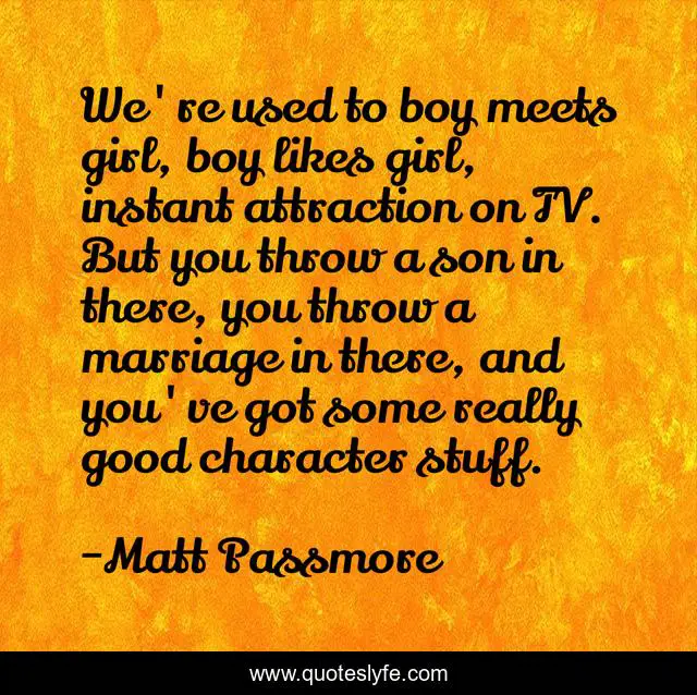 This page presents the quote "We're used to boy meets girl, boy likes girl, instant attraction on TV. But you throw a son in there, you throw a marriage in there, and you've got some really good character stuff.". Author of this quote is Matt Passmore. This quote is about good, character, son,.