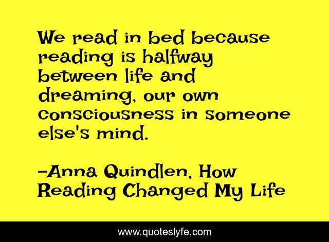 This page presents the quote "We read in bed because reading is halfway between life and dreaming, our own consciousness in someone else's mind.". Author of this quote is Anna Quindlen, How Reading Changed My Life. This quote is about consciousness, mind, reality, imagination, reading, dreams,.