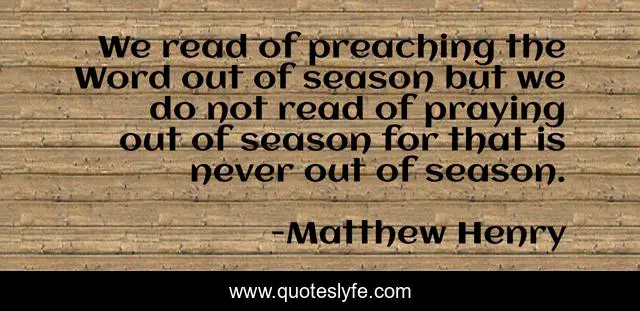 This page presents the quote "We read of preaching the Word out of season but we do not read of praying out of season for that is never out of season.". Author of this quote is Matthew Henry. .