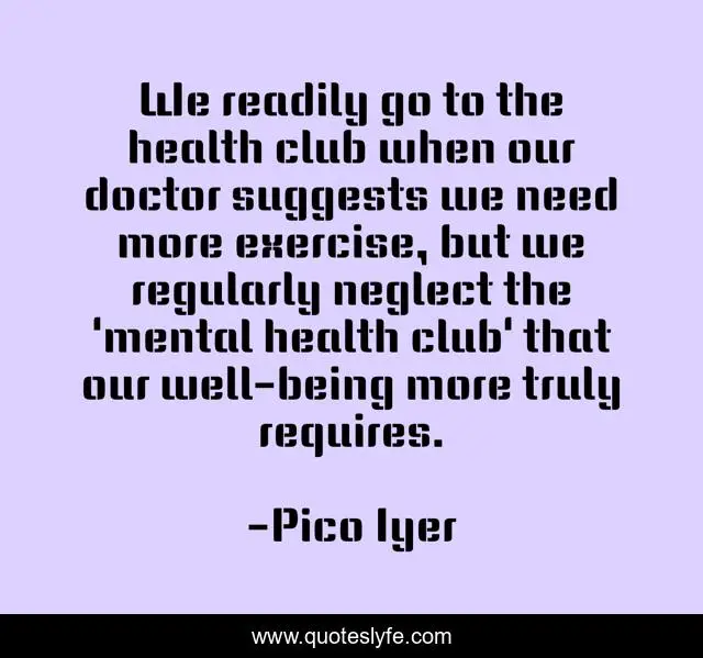 This page presents the quote "We readily go to the health club when our doctor suggests we need more exercise, but we regularly neglect the 'mental health club' that our well-being more truly requires.". Author of this quote is Pico Iyer. This quote is about mental health, doctor,.