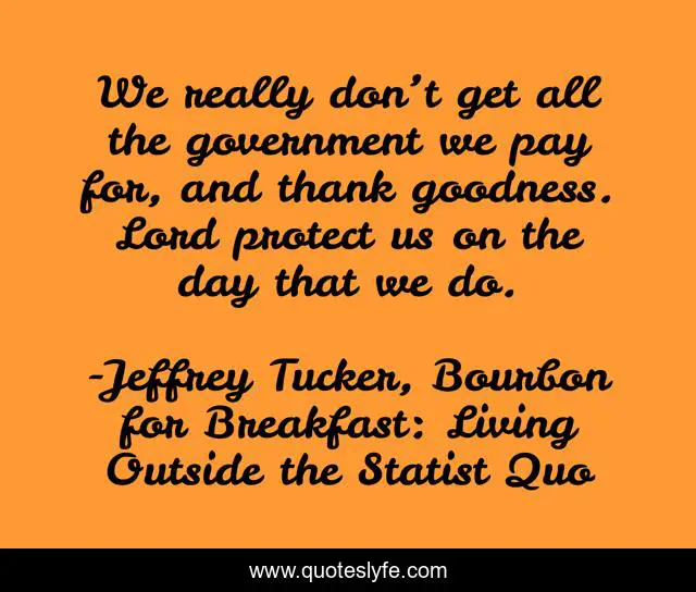 This page presents the quote "We really don’t get all the government we pay for, and thank goodness. Lord protect us on the day that we do.". Author of this quote is Jeffrey Tucker, Bourbon for Breakfast: Living Outside the Statist Quo. This quote is about libertarian, tucker, mises-institute,.