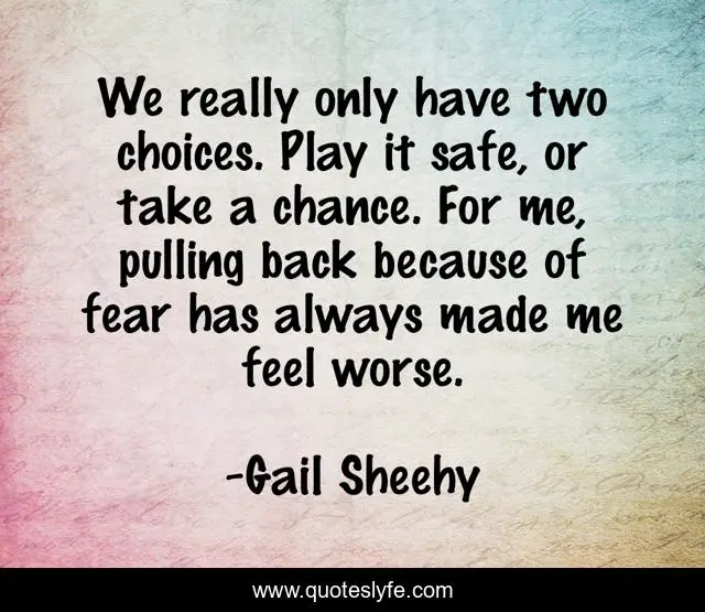 This page presents the quote "We really only have two choices. Play it safe, or take a chance. For me, pulling back because of fear has always made me feel worse.". Author of this quote is Gail Sheehy. This quote is about me, fear, choices,.