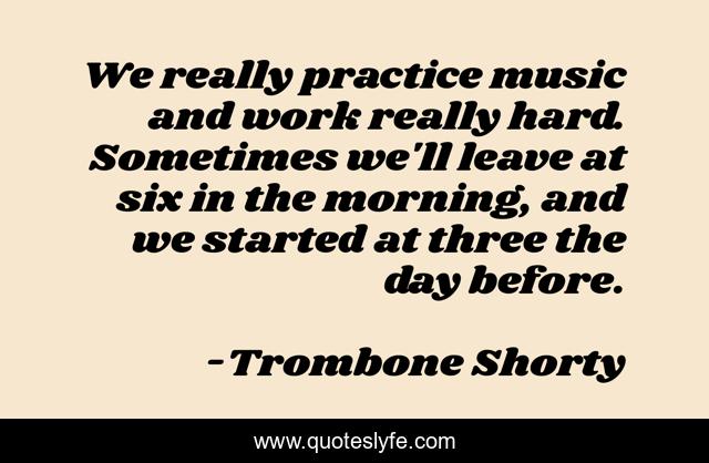 This page presents the quote "We really practice music and work really hard. Sometimes we'll leave at six in the morning, and we started at three the day before.". Author of this quote is Trombone Shorty. This quote is about work, music, day,.