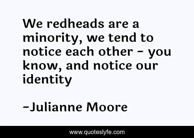 This page presents the quote "We redheads are a minority, we tend to notice each other - you know, and notice our identity". Author of this quote is Julianne Moore. This quote is about red-hair, identity, redheads,.