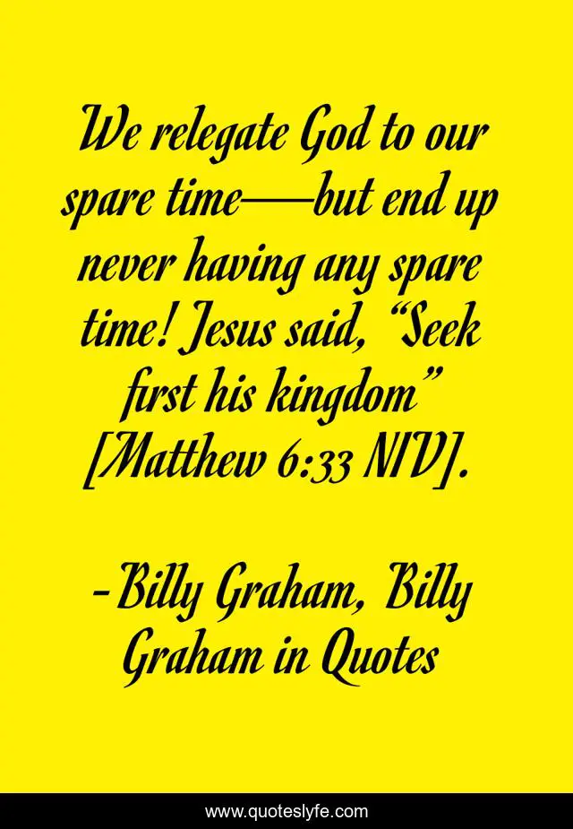 This page presents the quote "We relegate God to our spare time—but end up never having any spare time! Jesus said, “Seek first his kingdom” [Matthew 6:33 NIV].". Author of this quote is Billy Graham, Billy Graham in Quotes. This quote is about billy-graham, time,.