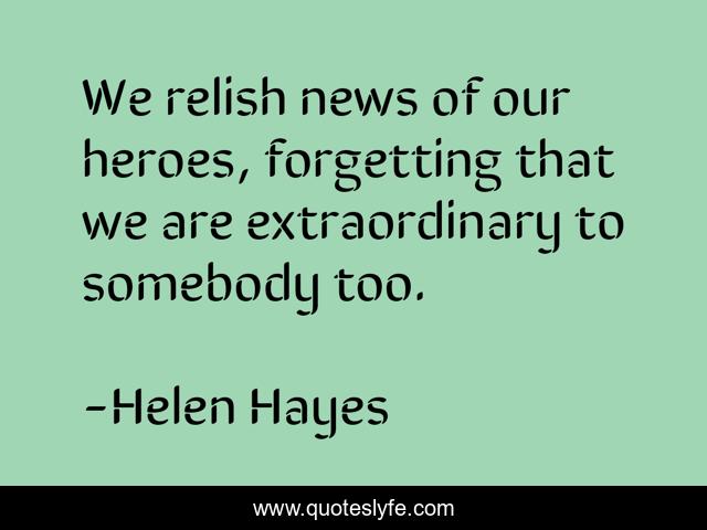 This page presents the quote "We relish news of our heroes, forgetting that we are extraordinary to somebody too.". Author of this quote is Helen Hayes. This quote is about extraordinary, heroes, news,.