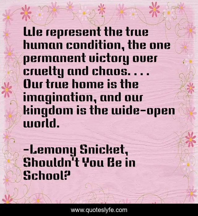 This page presents the quote "We represent the true human condition, the one permanent victory over cruelty and chaos. . . . Our true home is the imagination, and our kingdom is the wide-open world.". Author of this quote is Lemony Snicket, Shouldn't You Be in School?. This quote is about good-vs-evil, compassion, community, imagination, respect, kindness, human-condition, humanity,.