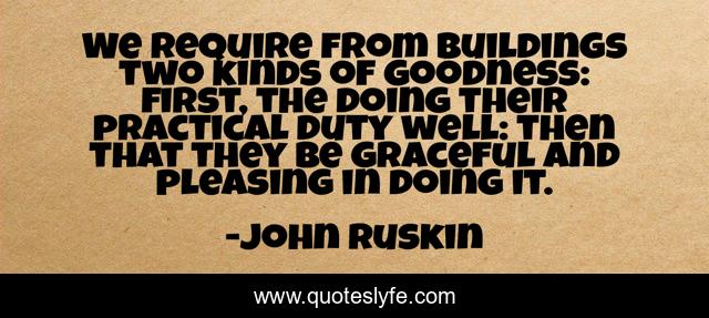 This page presents the quote "We require from buildings two kinds of goodness: first, the doing their practical duty well: then that they be graceful and pleasing in doing it.". Author of this quote is John Ruskin. This quote is about buildings, goodness,.