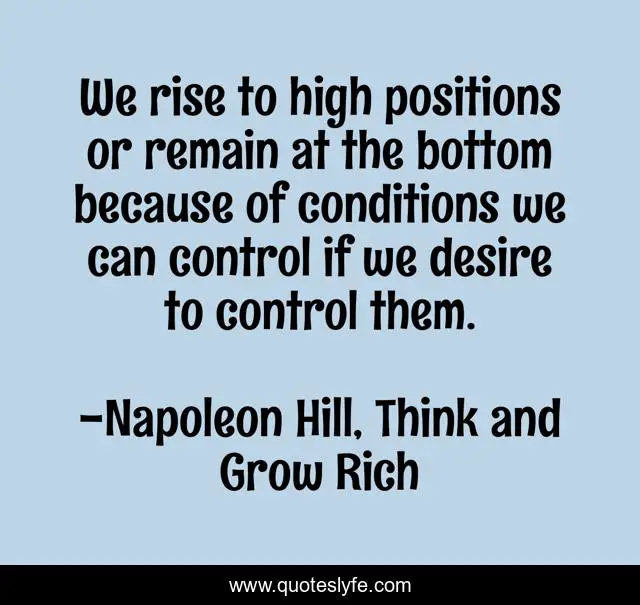 This page presents the quote "We rise to high positions or remain at the bottom because of conditions we can control if we desire to control them.". Author of this quote is Napoleon Hill, Think and Grow Rich. This quote is about success, mindset,.