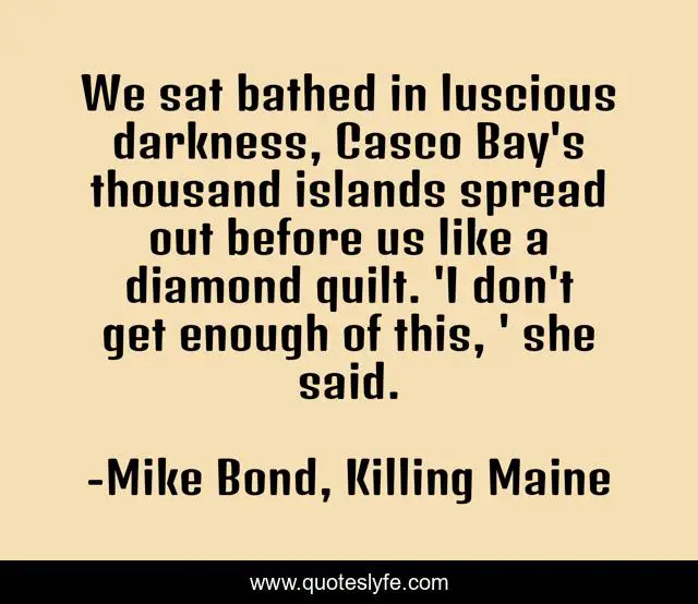 This page presents the quote "We sat bathed in luscious darkness, Casco Bay's thousand islands spread out before us like a diamond quilt. 'I don't get enough of this, ' she said.". Author of this quote is Mike Bond, Killing Maine. This quote is about scenery, diamond, darkness, quilt, luscious, bay, water, casco-bay, killing-maine,.