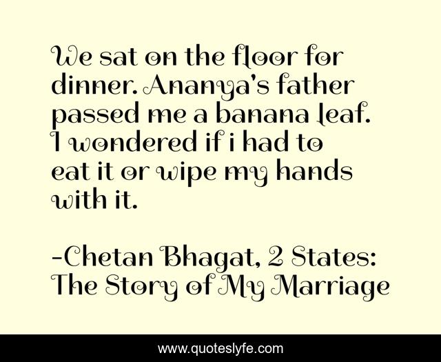 This page presents the quote "We sat on the floor for dinner. Ananya's father passed me a banana leaf. I wondered if i had to eat it or wipe my hands with it.". Author of this quote is Chetan Bhagat, 2 States: The Story of My Marriage. This quote is about funny, comedy,.