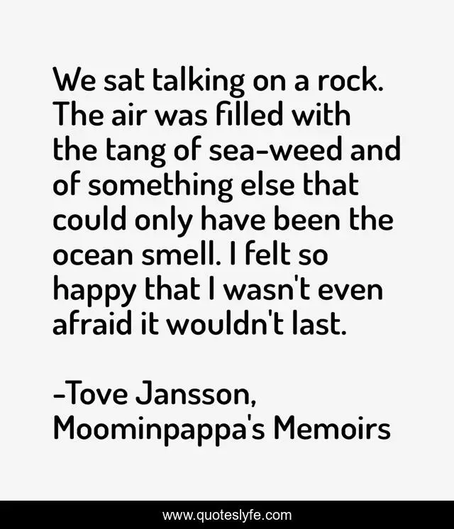 This page presents the quote "We sat talking on a rock. The air was filled with the tang of sea-weed and of something else that could only have been the ocean smell. I felt so happy that I wasn't even afraid it wouldn't last.". Author of this quote is Tove Jansson, Moominpappa's Memoirs. This quote is about friendship, anxiety, the-sea, happiness,.