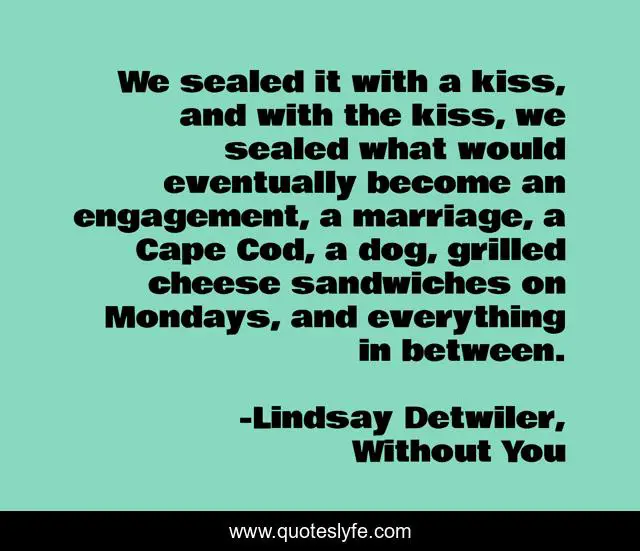 This page presents the quote "We sealed it with a kiss, and with the kiss, we sealed what would eventually become an engagement, a marriage, a Cape Cod, a dog, grilled cheese sandwiches on Mondays, and everything in between.". Author of this quote is Lindsay Detwiler, Without You. This quote is about romance, love, marriage, kiss, affection,.