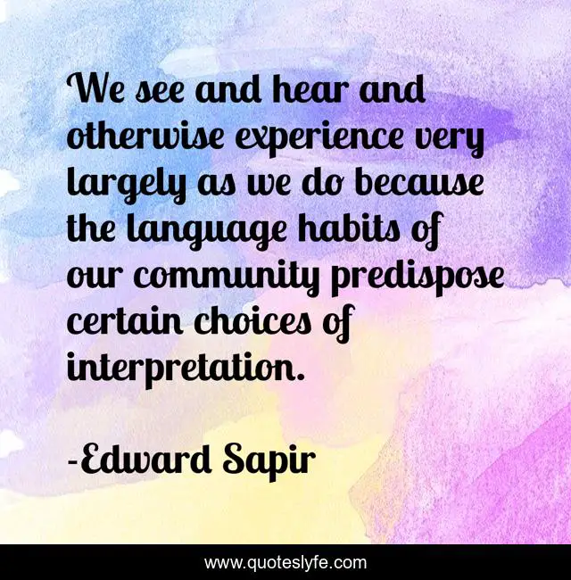 This page presents the quote "We see and hear and otherwise experience very largely as we do because the language habits of our community predispose certain choices of interpretation.". Author of this quote is Edward Sapir. This quote is about community, language, choices,.