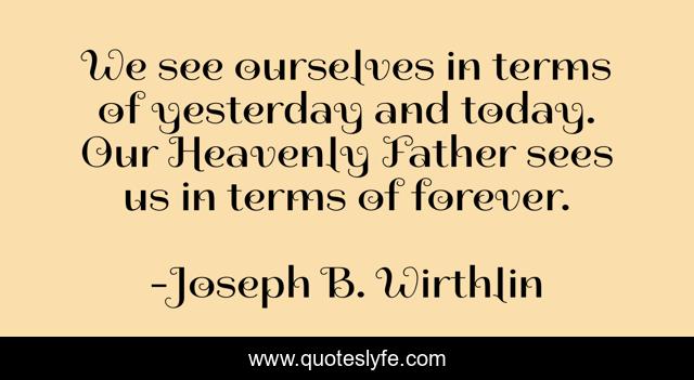 This page presents the quote "We see ourselves in terms of yesterday and today. Our Heavenly Father sees us in terms of forever.". Author of this quote is Joseph B. Wirthlin. This quote is about see, father, today,.