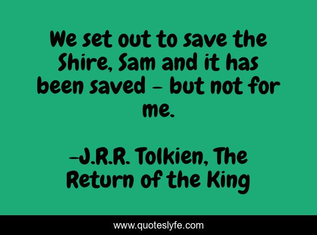 This page presents the quote "We set out to save the Shire, Sam and it has been saved - but not for me.". Author of this quote is J.R.R. Tolkien, The Return of the King. This quote is about lotr, sacrifice, success,.
