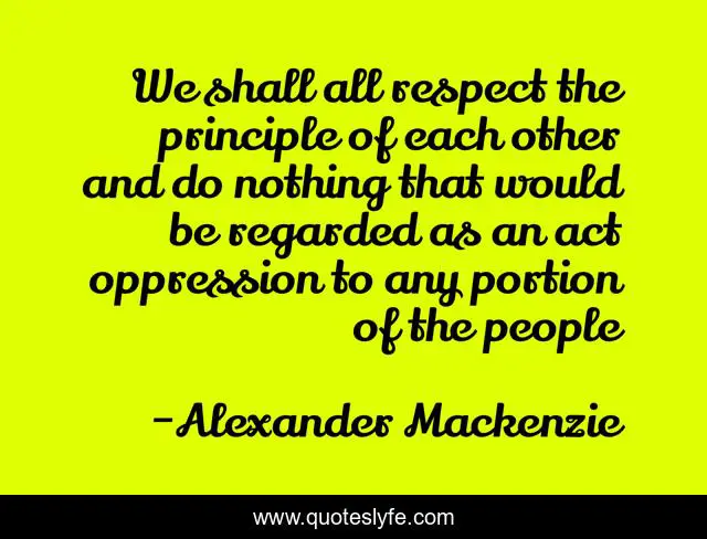 This page presents the quote "We shall all respect the principle of each other and do nothing that would be regarded as an act oppression to any portion of the people". Author of this quote is Alexander Mackenzie. This quote is about among-others, leadership,.