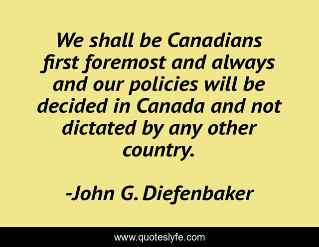 This page presents the quote "We shall be Canadians first foremost and always and our policies will be decided in Canada and not dictated by any other country.". Author of this quote is John G. Diefenbaker. This quote is about canada, canadians,.