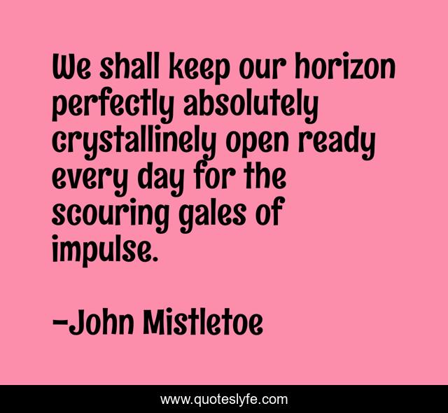 This page presents the quote "We shall keep our horizon perfectly absolutely crystallinely open ready every day for the scouring gales of impulse.". Author of this quote is John Mistletoe. .