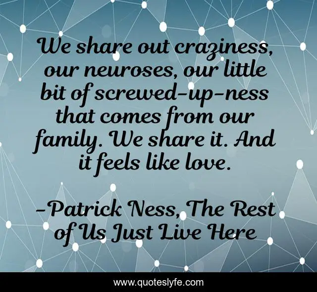 This page presents the quote "We share out craziness, our neuroses, our little bit of screwed-up-ness that comes from our family. We share it. And it feels like love.". Author of this quote is Patrick Ness, The Rest of Us Just Live Here. This quote is about crazy, love, family, affection,.