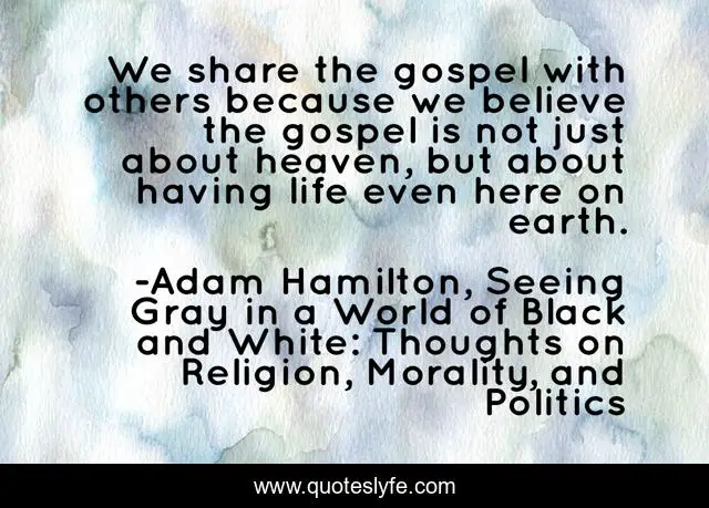 This page presents the quote "We share the gospel with others because we believe the gospel is not just about heaven, but about having life even here on earth.". Author of this quote is Adam Hamilton, Seeing Gray in a World of Black and White: Thoughts on Religion, Morality, and Politics. This quote is about gospel, christianity,.