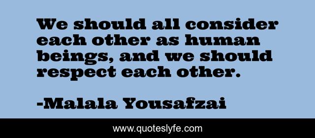 This page presents the quote "We should all consider each other as human beings, and we should respect each other.". Author of this quote is Malala Yousafzai. This quote is about human beings, human,.