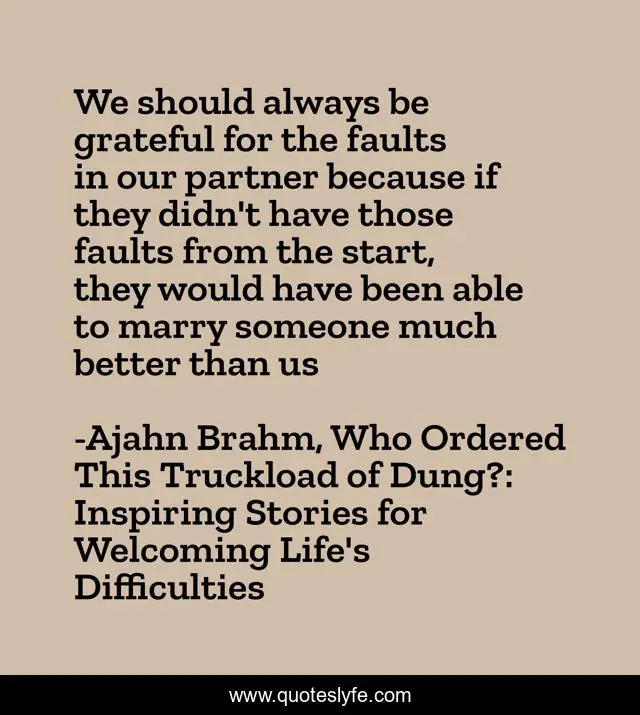 This page presents the quote "We should always be grateful for the faults in our partner because if they didn't have those faults from the start, they would have been able to marry someone much better than us". Author of this quote is Ajahn Brahm, Who Ordered This Truckload of Dung?: Inspiring Stories for Welcoming Life's Difficulties. This quote is about love, marrige, commitment, romance, inspirational, enthusiasm, affection,.
