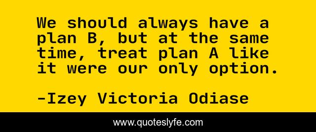 This page presents the quote "We should always have a plan B, but at the same time, treat plan A like it were our only option.". Author of this quote is Izey Victoria Odiase. This quote is about plans, plan-ahead, back-up, back-up-plan, goals, plan-a, plan-b, plan,.