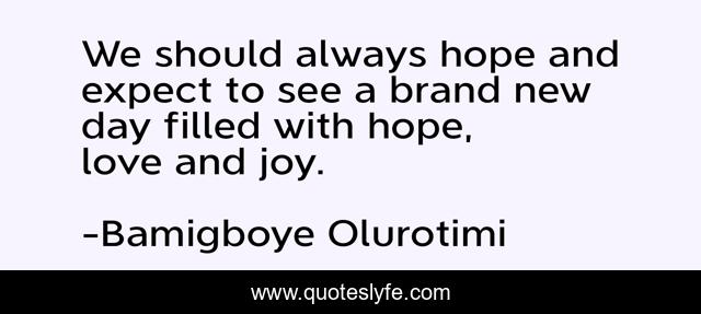 This page presents the quote "We should always hope and expect to see a brand new day filled with hope, love and joy.". Author of this quote is Bamigboye Olurotimi. This quote is about life, love, beauty, joy, year, confidence, season, choice, day,.