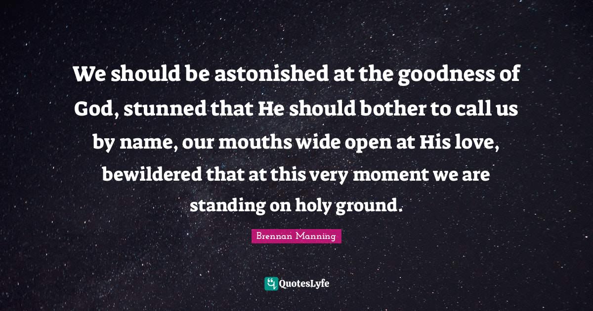 This page presents the quote "We should be astonished at the goodness of God, stunned that He should bother to call us by name, our mouths wide open at His love, bewildered that at this very moment we are standing on holy ground.". Author of this quote is Brennan Manning. This quote is about stunned, holy ground, goodness of god, names, his love, standing, wide, mouths, bewildered,.