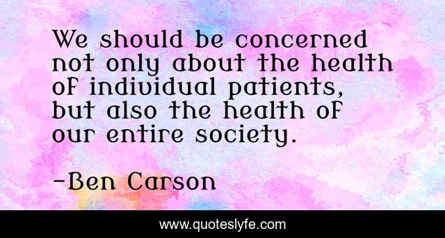 This page presents the quote "We should be concerned not only about the health of individual patients, but also the health of our entire society.". Author of this quote is Ben Carson. This quote is about society, individual, health,.