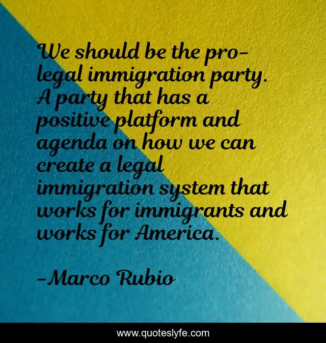 This page presents the quote "We should be the pro-legal immigration party. A party that has a positive platform and agenda on how we can create a legal immigration system that works for immigrants and works for America.". Author of this quote is Marco Rubio. This quote is about party, america, legal,.