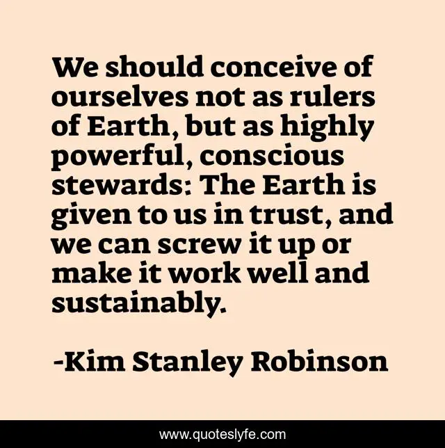This page presents the quote "We should conceive of ourselves not as rulers of Earth, but as highly powerful, conscious stewards: The Earth is given to us in trust, and we can screw it up or make it work well and sustainably.". Author of this quote is Kim Stanley Robinson. This quote is about earth, work, powerful,.