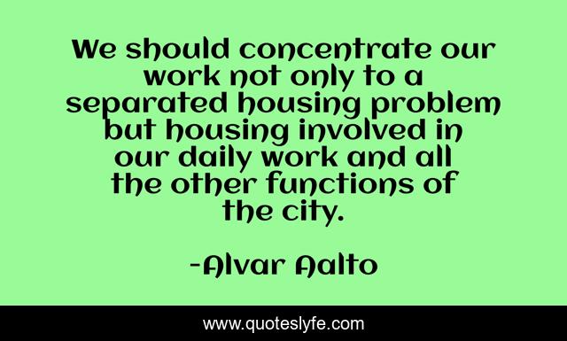 This page presents the quote "We should concentrate our work not only to a separated housing problem but housing involved in our daily work and all the other functions of the city.". Author of this quote is Alvar Aalto. This quote is about city, work, daily,.