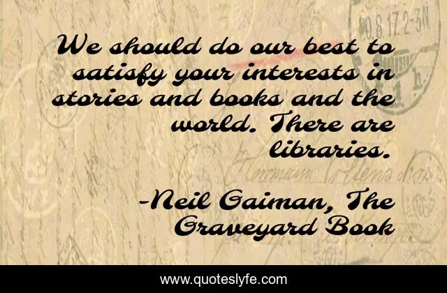 This page presents the quote "We should do our best to satisfy your interests in stories and books and the world. There are libraries.". Author of this quote is Neil Gaiman, The Graveyard Book. This quote is about libraries, silas-from-the-graveyard-book, books, stories,.