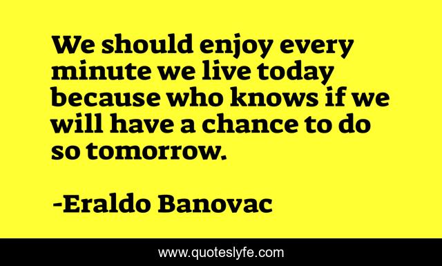 This page presents the quote "We should enjoy every minute we live today because who knows if we will have a chance to do so tomorrow.". Author of this quote is Eraldo Banovac. This quote is about life, sociology, philosophy, positive, motivational, confidence, chance, optimistic, inspirational,.