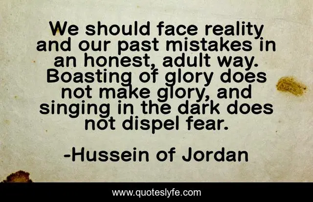 This page presents the quote "We should face reality and our past mistakes in an honest, adult way. Boasting of glory does not make glory, and singing in the dark does not dispel fear.". Author of this quote is Hussein of Jordan. This quote is about past, mistakes, reality,.