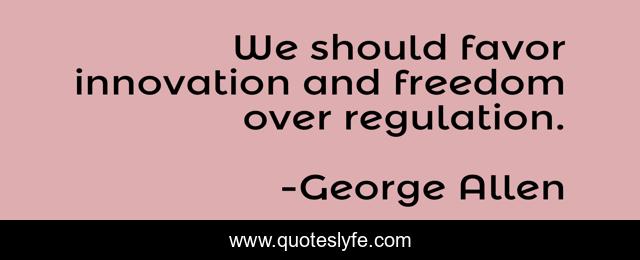 This page presents the quote "We should favor innovation and freedom over regulation.". Author of this quote is George Allen. This quote is about regulation, innovation,.