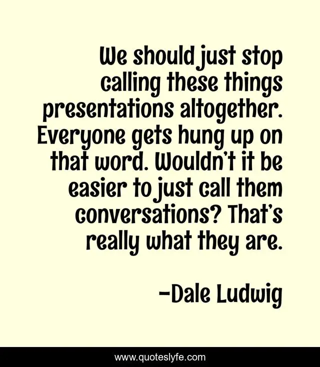 This page presents the quote "We should just stop calling these things presentations altogether. Everyone gets hung up on that word. Wouldn’t it be easier to just call them conversations? That’s really what they are.". Author of this quote is Dale Ludwig. This quote is about communication, business-presentations, presentation-skills, presentations,.