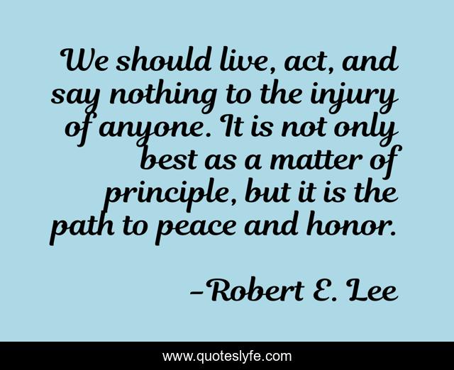 This page presents the quote "We should live, act, and say nothing to the injury of anyone. It is not only best as a matter of principle, but it is the path to peace and honor.". Author of this quote is Robert E. Lee. This quote is about path, peace, honor,.