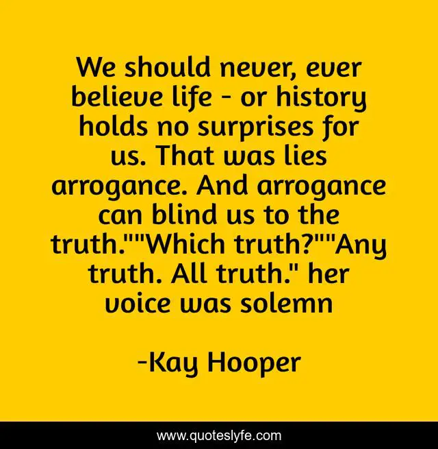 This page presents the quote "We should never, ever believe life - or history holds no surprises for us. That was lies arrogance. And arrogance can blind us to the truth.""Which truth?""Any truth. All truth." her voice was solemn". Author of this quote is Kay Hooper. This quote is about mystery, knowledge, truth, arrogance,.