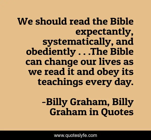 This page presents the quote "We should read the Bible expectantly, systematically, and obediently . . .The Bible can change our lives as we read it and obey its teachings every day.". Author of this quote is Billy Graham, Billy Graham in Quotes. This quote is about bible, billy-graham,.