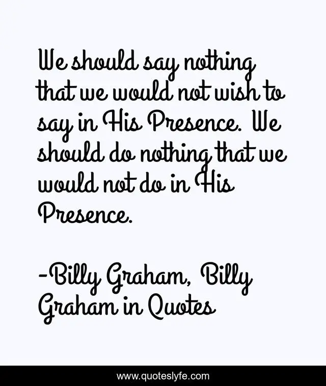 This page presents the quote "We should say nothing that we would not wish to say in His Presence. We should do nothing that we would not do in His Presence.". Author of this quote is Billy Graham, Billy Graham in Quotes. This quote is about speech, billy-graham,.