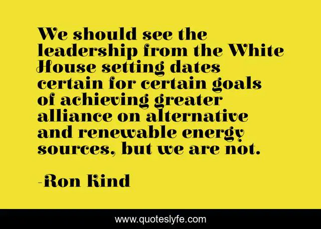 This page presents the quote "We should see the leadership from the White House setting dates certain for certain goals of achieving greater alliance on alternative and renewable energy sources, but we are not.". Author of this quote is Ron Kind. This quote is about energy, goals, achieving,.